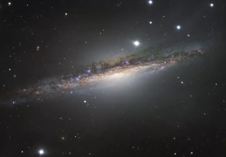 La instantánea, tomada con el telescopio VLT de la ESO en el desierto del Paranal (Chile) muestra una "colorida raya de estrellas, gas y polvo", como apunta el comunicado de la organización, ya que desde la Tierra esta galaxia de espiral un 15 % mayor que la Vía Láctea se ve totalmente de costado.