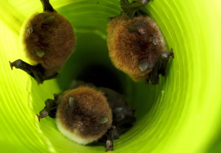 ¿Qué tiene ventosas en los pies y duerme en un tubo? Pista: come arañas saltadoras, chicharritas y moscas. Se trata del murciélago de ventosas de Spix, uno de los murciélagos más pequeños de los trópicos americanos, y la primera especie de murciélago que se agrega a la lista de animales que hacen llamados de comida únicos.