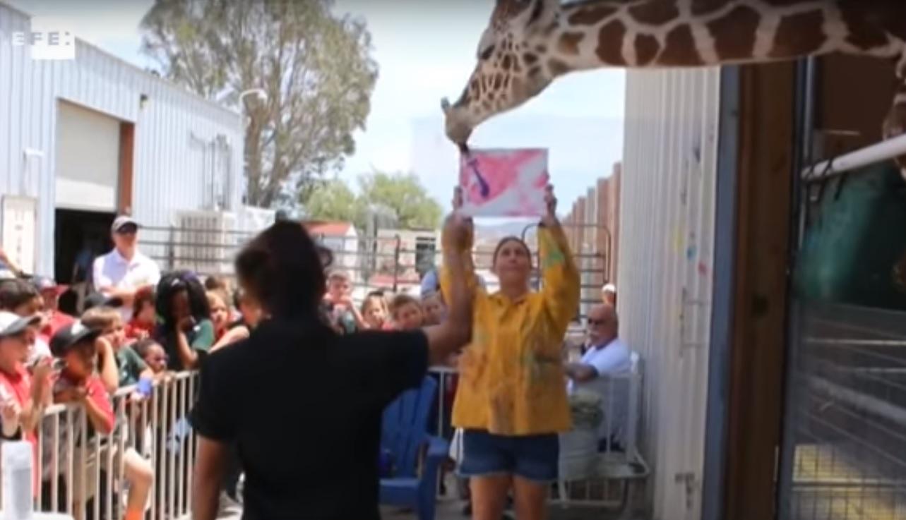 Además de presenciar las cualidades artísticas de Ozzie, los visitantes se divierten con las interacciones entre el mamífero y el propietario del santuario, como ocurre en el juego en el que Evans se coloca zanahorias en su boca y la jirafa, veloz, las roba con la agilidad de su extensa lengua.