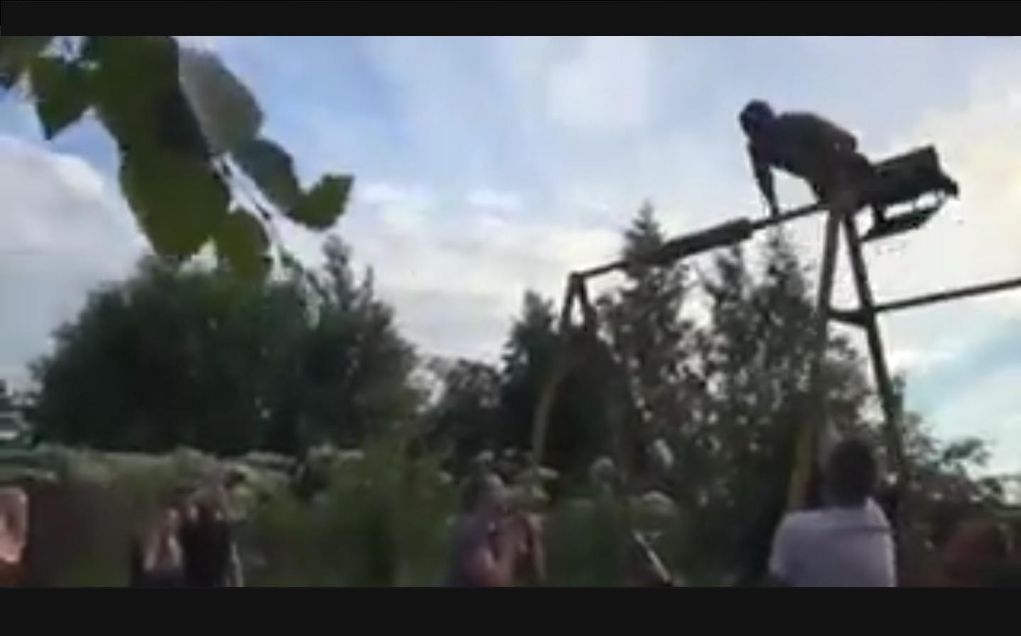 Este hombre se sube a un columpio que es sujetado por sus amigos para demostrar que puede dar vueltas de pie sin caerse.