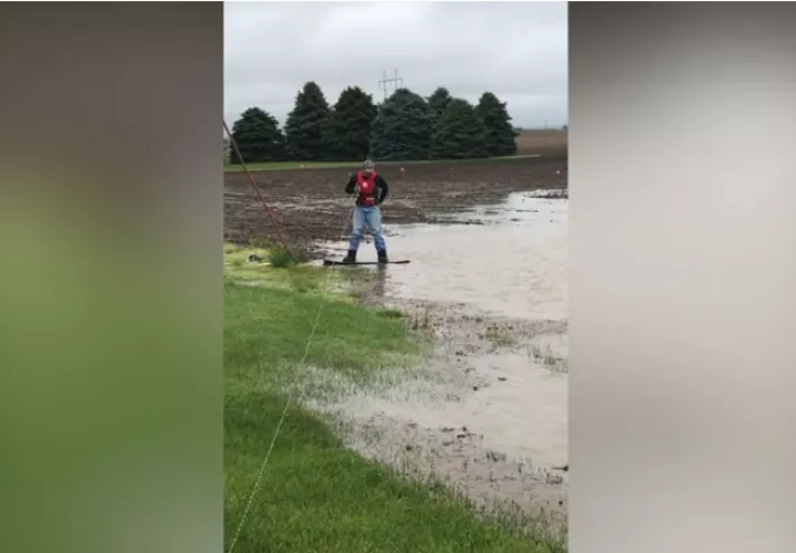 Al mal tiempo buena cara, dice un viejo y conocido refrán. Eso precisamente fue lo que hizo agricultor de Nebraska, Quentin Connealy, quien luego de las lluvias que cayeron esta semana esa región de Estados Unidos. Él decidió sacar provecho de la acumulación de agua sobre la tierra saturada para practicar un poco de 'wakeboarding' a lo largo de su campo de maíz inundado.