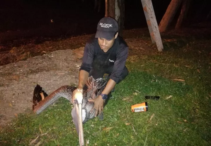 El agente de seguridad Marvin Lagos se convirtió anoche en un héroe para los amantes de los animales, al rescatar a un pelícano que había quedado atrapado en medio de las hojas de un árbol.