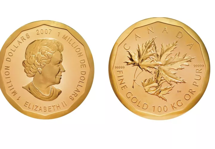 La moneda, manufacturada en 2007 por la Real Casa de la Moneda de Canadá dentro de una serie muy limitada, es de oro puro al 99,999 % y cuenta en una de sus caras con el perfil de la reina Isabel II y en la otra la típica hoja de arce símbolo de Canadá.