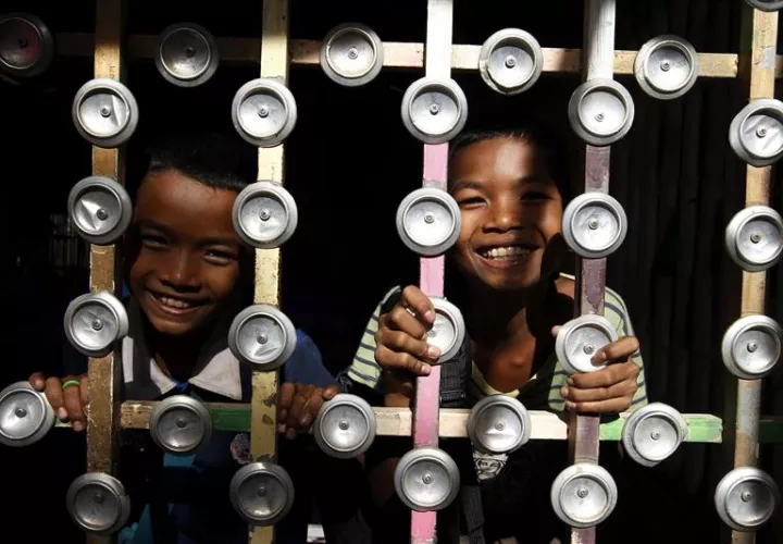 Ruedas, vidrio y coco, materiales usados para crear escuela en Camboya
