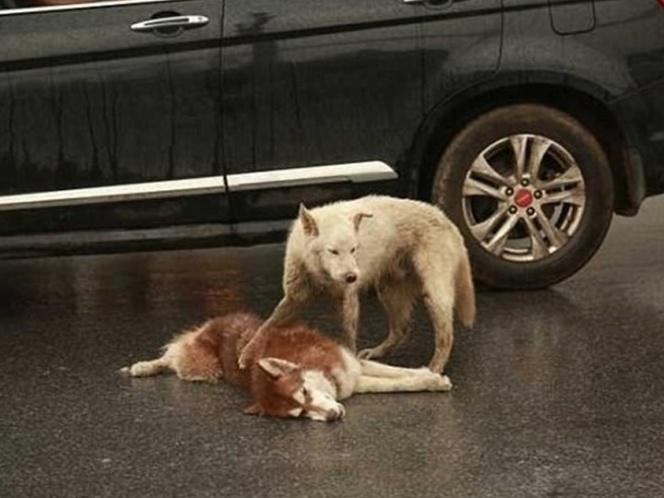 En un video, que ya se ha hecho viral, se observa como un perro, de pelaje blanco intenta reanimar a su compañero, quien yace inerte luego de ser atropellado.