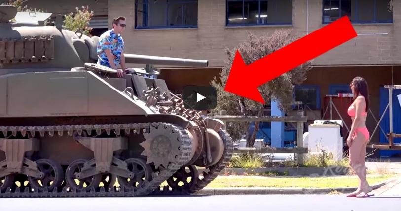 El joven que acababa de ser rechazado se sube a un tanque y hace estallar el auto de la chica. Obviamente, se trató de una animación gráfica.