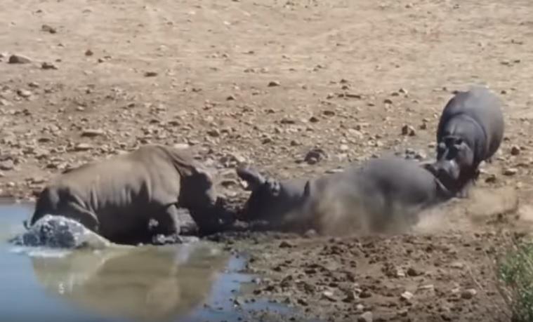A los pocos segundos de la filmación, que al parecer fue editada, se aprecia que en medio de la lucha aparece un segundo hipopótamo, mientras el rinoceronte queda de espaldas a la charca de agua.