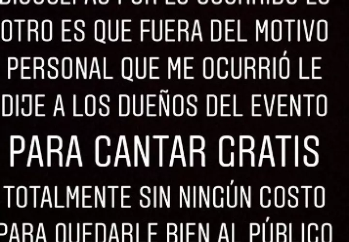 Luego de eso el colonense no se quedó callado y en su "history" de Instagram "Primero que todo mil disculpas por lo ocurrido. Lo otro es que fuera del motivo personal que me ocurrió, le dije a los dueños del evento para cantar gratis, para quedar bien con el público y ya no quieren. Lo otro es que voy a devolver dinero, yo espero que a la gente que fue le devuelvan el dinero porqué llenaron con mi imagen el lugar", finalizó "El Peluche" como también se le conoce.