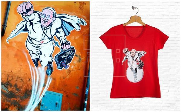 Un grafiti que retrataba al papa Francisco como "Superman" y que apareció en el barrio Borgo Pío, en los aledaños del Estado Vaticano, se ha convertido ahora en una camiseta cuya parte de su venta se destinará a las obras de caridad del pontífice.
