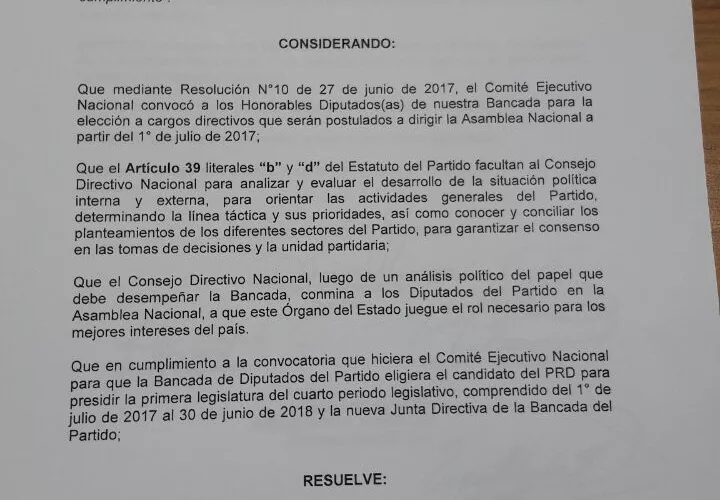 Directivos y miembros de la bancada ha tomado la decisión de designar como candidato a la presidencia de la Asamblea al diputado Carlos Motta.